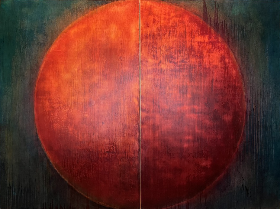 Shellac, ink, oil and gold leaf on wood, 80″ x 60″